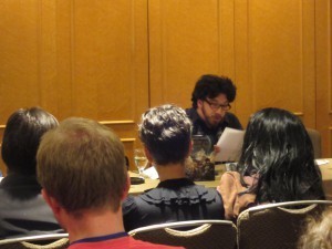 As an interested and slightly worried acquaintance I had heard him read from Throne of the Crescent Moon at the World Fantasy Convention in 2010. As his friend I got to hear him read his new short story, “Without Faith, Without Law, Without Joy” at Worldcon last Saturday. It was the first time I’d heard the work, and I was greatly impressed not just by his delivery, but by the story itself. He was aided by historical re-enactor Tom Nanson, reading from Spenser’s Faerie Queen with great authority and proper diction (not to mention a fantastic costume).