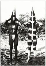 Es interesante ver las semejanzas:- cuerpos pintados- actitud ritual de las manos- extensiones (¿gorros?) en forma de conos-uso del negro y blanco
