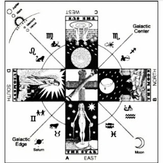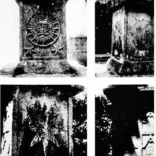 He aquí la descripción del pedestal de la Cruz de Hendaya, hecha por Fulcanelli. "En cada una de las cuatro caras del pedestal, observamos un símbolo diferente. Vemos en una de ellas la imagen del sol; en otra, la de la luna; la tercera nos muestra una gran estrella, y la última, una figura geoniétrica que, según acabamos de decir, no es sino el esquema adoptado por los iniciados para caracterizar el ciclo solar. Es un simple círculo dividido en cuatro sectores por dos diámetros que se cruzan en ángulo recto. En cada uno de lo sectores figura una A, que los señala como las cuatro edades del mundo, en este jeroglífico completo del universo, formado con signos convencionales del cielo y de la tierra, de lo espiritual y de lo temporal, del macrocosmo y del microcosmo, y donde volvemos a encontrar, asociados, los emblemas mayores de la redención (cruz) y del mundo (círculo)".