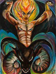 4.- Acercamiento a la bestialidad o animalidad. Su obra pictórica, como sus trabajos con máscaras de animales, demuestran el continuo interés de la bruja neozelandesa de retornar a la bestialidad, lo que se llama Atavismo. Esto recuerda la labor realizada por el brujo Austin Osman Spare. En este sentido su culto a Pan tiene una lógica, sin duda, pues se trata de un dios mitad hombre-mitad animal.
