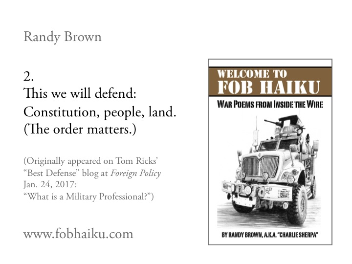 Inspired by Ricks' challenge of brevity, poet Randy Brown ("Welcome to FOB Haiku: War Poems from Inside the Wire") memorably responded with seven pithy insights in haiku form. The result was published at the "Best Defense" blog Jan. 24, 2017. Given that world events seem to increasingly support Ricks' premise—that our military leaders must navigate an ever-shifting professional terrain—we thought to revisit the haiku here: