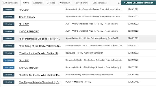 The way to success is to aim high. Here’s a photo example of what my Submittable account looks like at any given time. You’ll start to see results when you broaden the scope of your submissions.