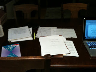 A few people have asked me where The Awakening II is. Which makes me very happy, as I hope it means they read The Awakening. The answer makes me less happy: It's on my dining room table. That is, the first draft of it is. A second/third draft (I rewrite in pieces) is in the laptop. I should add that, actually, first I outline, which sometimes takes longer than the first draft. So I basically write from point to point in my outline, in sort of a mad dash to the end.