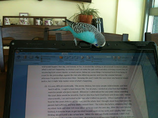 I also look for too much action. Sometimes a reader needs a break to just breathe and be with the characters. After I've made those changes, and I feel like I'll throw up if I look at it one more time, I'll send it on to first readers. (That's Mr. Bird reviewing some of my writing. I don't always takes his suggestions, but don't tell him, he's very sensitive.)