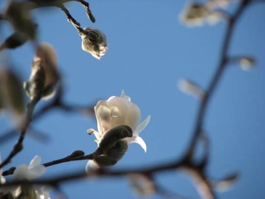 Framed by a series of branches, one budding bloom stands apart from the rest. Like an explosion, the slender white petals erupt. Still caught in the shadows of the mid-morning sun, there are only a few that the sun's rays hit. Those few are blinding white against the lapis lazuli colored background of the cloudless sky. A couple of the reaching petals curl, as if the weight of the world bends them. The gray-green of their former prison is covered with silky cream colored hairs that would tickle the touch. Many of its neighboring brethren have yet to join in the escape from their pod captives, but it's only a matter of time until they join in the celebration of the Spring sun.