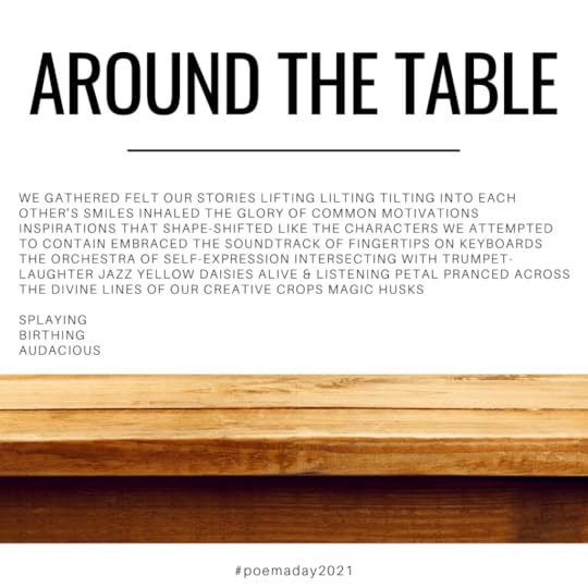 we gathered felt our stories lifting lilting tilting into each other’s smiles inhaled the glory of common motivations inspirations that shape-shifted like the characters we attempted to contain embraced the soundtrack of fingertips on keyboards the orchestra of self-expression intersecting with trumpet-laughter jazz yellow daisies alive & listening petal pranced across the divine lines of our creative crops magic husks