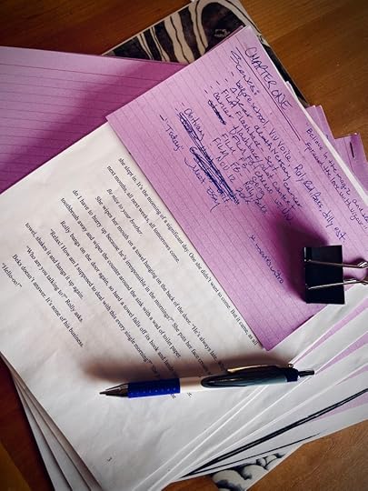 Cut and paste a chapter at a time from the Word document I used for beta reads, into a ‘main’ Google document. I’m writing in a Google doc because my little old laptop does not enjoy working in Word, and because it constantly updates safely. Edit the chapter. Word by word. Line by line. There have already been several chapters where *major* changes have happened. Thank you again to all those who offered incredible feedback in the beta reads. Print the chapter. Read the chapter again. Make more edits. (I always find a least one typo when I read the chapter out on paper.)Make a list of the main scenes and any important information (like, what day it is, or if there’s something I need to remember in the chapter for a forthcoming chapter) on a large cue purple card. Staple it all together. Make the new edits in the chapter on the Google doc.Cut and paste the chapter into Scrivener in a new manuscript. Scrivener houses ALL versions of the story. Cut and paste the next chapter to review in the Google doc. Repeat.I admit that even after all these years writing, I still get insects in my tummy before I sit down and write. It’s like…I’m nervous to work on my own writing, with my own characters. I’m nervous to face the immense amount of work each chapter asks of me in editing. But then…when I finally start, and just ‘do it’, my tummy relaxes and I do it. It feels really great to have some tactile exchanges with the writing when printing out hard copies and making chapter notes.