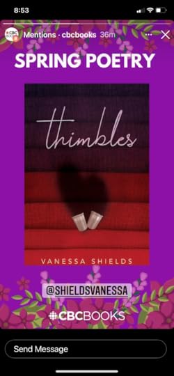 I just about passed out when I saw this morning on Instagram that CBC Books has included Thimbles in its top 55 books of poetry to read this spring! I share the list with 54 other incredible poets, some of whom are my idols (!), but there you have it. Me. On the list with the others!