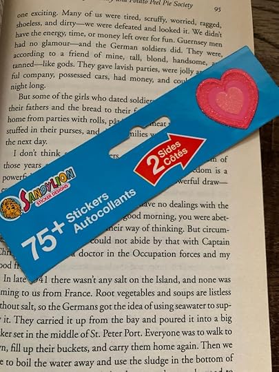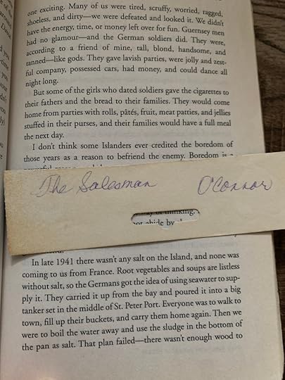 Inside a copy of The Guernsey Literary and Potato Peel Society by Annie Barrows and Mary Ann Shaffer I found an interesting book mark. The top of a sticker pack…perhaps it was a pack of heart stickers? The edges darkened with age…clearly cut with scissors…and not in a straight line. I love the reuseablity of this piece of cardboard. And what is: The Salesman…O’Connor? It is another book! The Salesman by Joseph O’Connor! Incredible…two books in one!