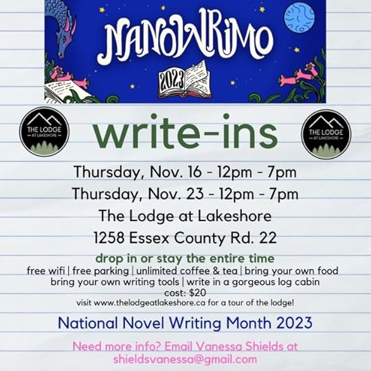 I’m participating in National Novel Writing Month (aka NaNoWriMo) this November. I’ll be hosting two write-ins at the Lodge at Lakeshore, a gorgeous, giant log cabin perfect for writing your masterpiece! Whether you’re doing NaNo or not, you’re more than welcome to come and write!