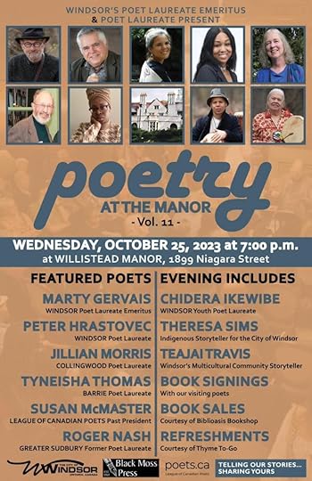 Arrive early to get a seat at the next edition of Poetry at the Manor! Book sales and signing and yummy snacks post-reading. Parking on site. 7pm start!