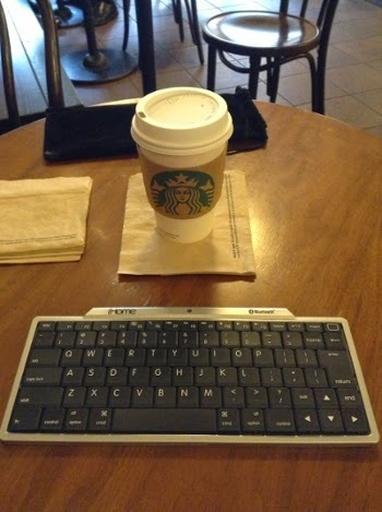 In the photo above, notice the napkins under my cup. I lean my iPhone against the cup while I type and the napkins keep it from sliding off.
