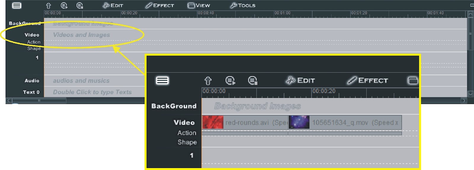 Drag the same video clip from the STREAM onto the VIDEO line again and you will have your first loop. When you press the PREVIEW BUTTON now, it will play it twice and you can repeat this process as many times as you need in order to get the length of playback you want. You can also drag the end of the last clip back to make it play for a shorter length of time if needs be (it doesn't change the speed at which it plays though).
