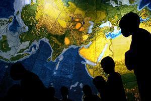 I gave a talk to students who are studying to become teachers at the University of Maine in Farmington at their annual Diversity Conference. At the same time, the New England Geographical Society was meeting on campus. And a part of that conference was a 20-foot inflatable balloon, hand-painted to look like a globe, and set up in the university gym. It happened that the talk I gave had the title, Center of the World. I’ve been fascinated by the Buddhist idea that wherever we are, anywhere in the world, we are in the center. Wherever we walk, everybody is walking in their own sacred space. Of course where I was going with that is that, through books, we can begin to imagine the world’s of others. I found this to be the most wonderful syncronicity that I could walk down the windblown, golden streets of Farmington to the gym and see this world, called EarthView, a creation of Bridgewater State University. This photograph is by Jacob Belcher and it appears in the Bridgewater Independent. He captures the vivid colors of the gorgeously painted earth and the silhouettes of students who have climbed inside Earthview. ”It’s a globalized world,” the newspaper quotes Bridgewater geography professor Vernon Domingo. Here was a grand way to experience it. Soon I’ll post my talk, Center of the World,