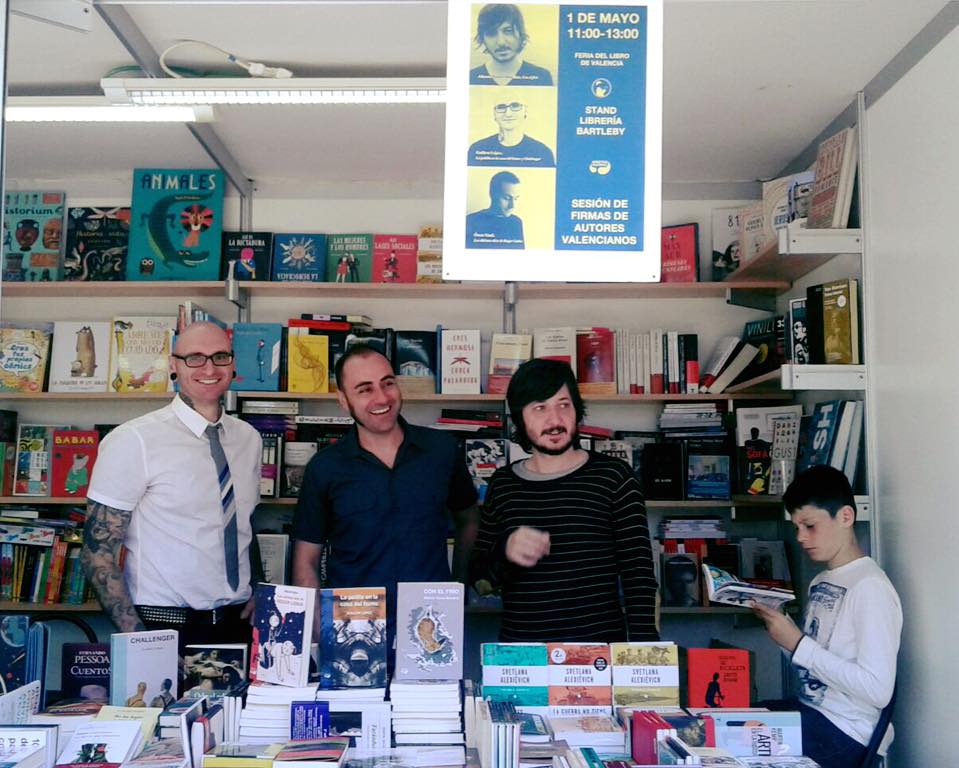 Y por último, os dejo con una fotografía de mi paso por la Feria del Llibre de València, el pasado uno de mayo. Compartí caseta con los geniales Óscar Gual y Alberto Torres Blandina. Narrativa emergida valenciana de primera trinchera. Dando batalla.