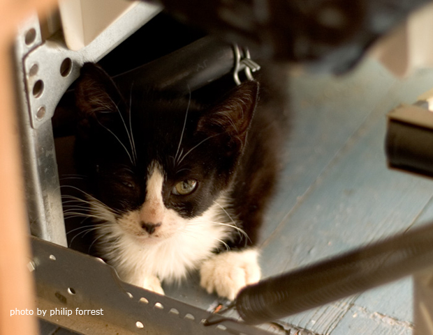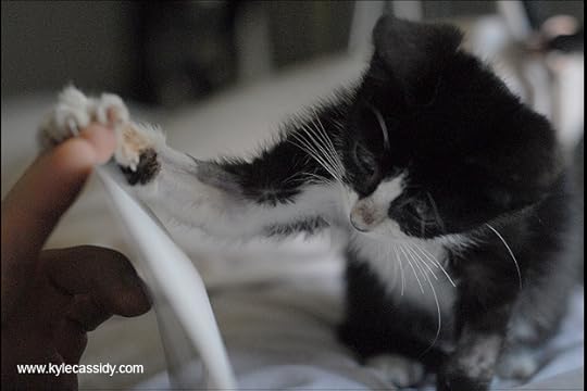 Over the next couple of days, she got a terrible eye infection and was a blind kitten running around in the back yard. It was easy to catch her then. Phil and Stacey and I caught her. She was feral, she hated people. So twice a day, we would chase her into a corner and throw a towel over her and then pet her for 30 minutes.