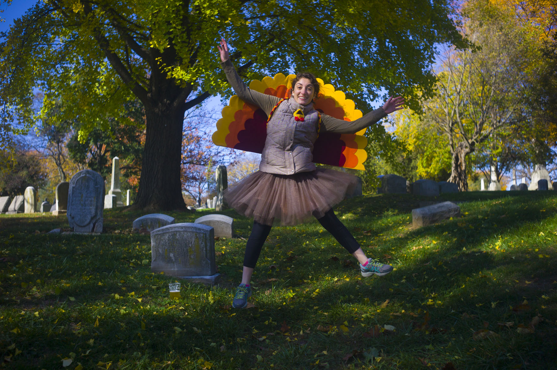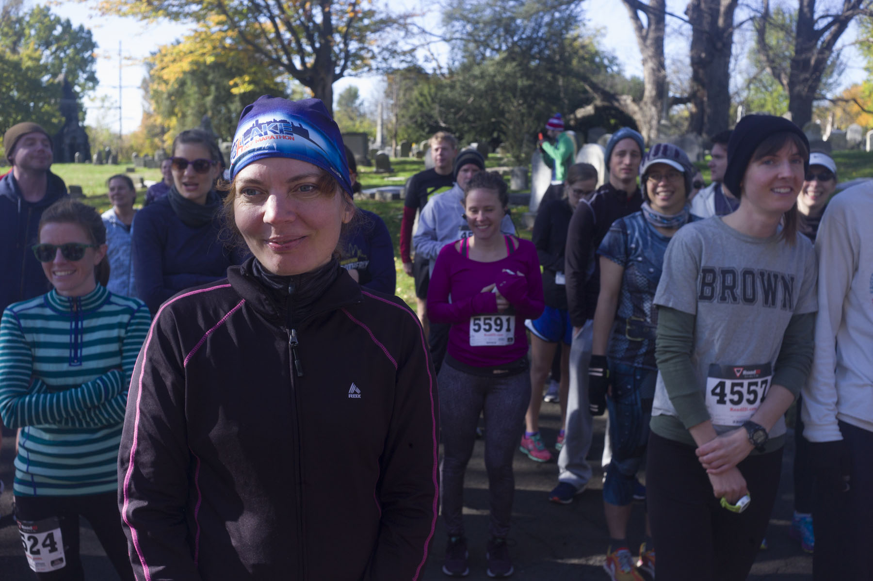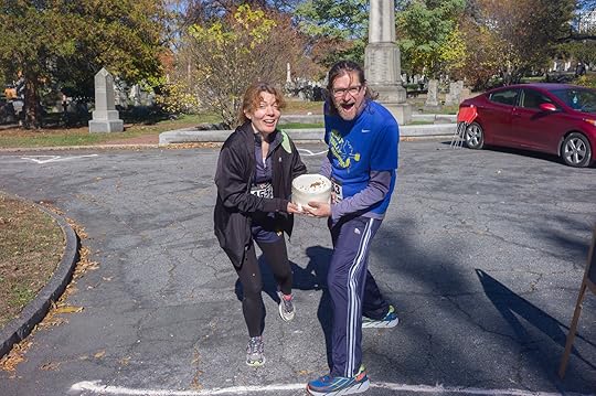 and I did the 5k Gobble Wobble race to help the Woodlands cemetery (where suffragette Mary Grew is buried). It was perfect racing weather. We unexpectedly won -- not the whole race, but a prize and we worked on a Top Sekrit Project after, in conjunction with the cemetery which might turn into something awesome. Or not. Who knows at this point.Getting ready to start.