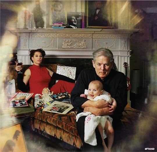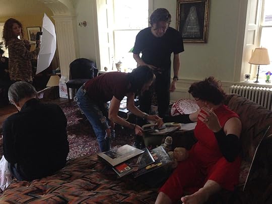 Setting up the scene you can see my high tech lighting system here -- on small shoot thru umbrella with a voice activated light stand. It was pretty simple. I used a 28mm lens and a Leica M9, triggered with Pocket Wizards. I'm trying to do everything with the Leica now because it's just so much smaller than the Nikon and I find myself thinking "what on earth am I going to do with a 36 megapixel file?" You can see that pile of things on the chez that Amanda picked out as being important. They range from magazines to influential records to a dalek. (Is dalek capitalized? You would't capitalize "lion" but you would "Parisian"... Ellen Datlow would know.) The 28mm was just barely wide enough to get the shot that I needed, and I ran out of room, I had to press the camera on the back wall -- I couldn't look through the viewfinder or put it on a tripod. I was actually facing the wall, holding the camera up against it, trying not to get my shoulder in the shot (it was in a bunch of them) while Neil helped to make Ash smile -- not that he's not always smiling. So we banged away at it for a while and it was done and we opened a bottle of wine. Like you do.