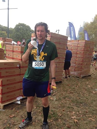 It was a warm, muggy day. Really muggy. Which didn't bode well. And when we went out of the blocks, the pace group immediately got stuck behind some slow people. (In big races hundreds, or thousands of people wildly overestimate their paces and even with staggered starts, the first mile is often just trying to get around people who put themselves in a far too ambitious corral) I was worried that if I ran too slowly at first I wouldn't have enough to make it up in the end -- If we ran a 9:30 the first mile, I'd have to run an 8:30 somewhere else to make it up and that sounded bad. So I left the pace group. And by mile 6 I was about a minute and a half in front of them (I know this because I saw them at an out-and-back) and things were going really well, I thought I might be able to do a 1:55, which would be really great. By mile 8 they'd gotten a bit less well, and by mile 10 things were terrible. I had to fight to keep my head up and every step was a constant battle to keep from stopping. There's a loud voice in your head saying You can end this pain right now! You can walk for a bit! There's no shame in walking! but even when the race isn't important, quitting is bad -- it has a catastrophic and cascading effect because you've allowed quitting to be possible -- once you've done it, you can never again be the person who's never quit. That's the other voice. I figured that as long as I could still possibly make it in sub 2:00 I'd have to keep pushing, even thought I didn't have much push. I slowed down a lot and started losing all the time I'd banked but I kept willing myself to go faster. It was all I could do in mile 13 to speed up to 9:13 from the 9:30 I'd run in mile 12 and as I finally saw the finish line up ahead I was starting to lose my peripheral vision. Trillian had come out to watch and although I knew where she should be, I couldn't see her, despite passing within a foot of her. I figured I'd just run as hard as I could and if I blacked out and fell over, I'd at least get a good photo as medics dragged me across the finish line, or, possibly better yet, I insisted on crawling while they hovered over me with an IV bag.