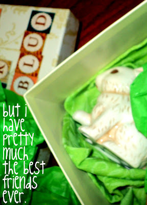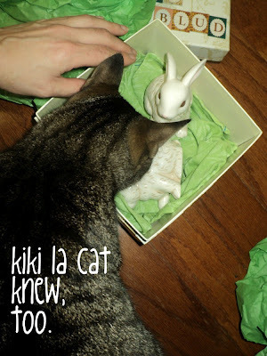 That's right. Ericka made bludbunnies, nestled them in fake grass, crafted a box with Criminy's face on it, and planted it on my front porch as a surprise.Because she (and her family!) is/are AWESOME.