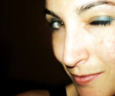 It's a pure mineral shade of glittery teal from Sweet Libertine, and it's lovely. I thought it would make my hazel eyes go brown, because that's what the color wheel would indicate. But really, it just made me feel fancy. Same old dirty lakewater eyes, just with extra GOBLIN.