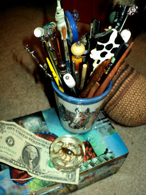 It's not in the studio, in the attic, in the basement, under my bed, or hidden in the secret box of secret memories that is hidden. I've found pocket watches, ponytails, Lego sharks, shaman armadillos, deer skulls, peacock feathers, crystals, an absinthe bottle, stones from Greece, a map from the Tour de France, a stone hippopotamus, juggling balls, a tin full of hay-golden four-leave clovers, and my collection of bellydance music.