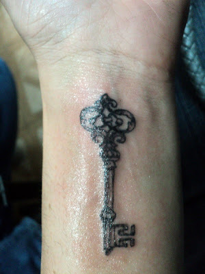 I've known for a while that I wanted a key, but I couldn't find the right one. I've been hunting through Etsy and Ebay and antique stores, trying to find the key that fit and practicing drawing them on my wrist with Sharpies. Then last week, it occurred to me that I should check the bookshelves. I pulled out Alice, and there it was.