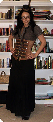 My first corset from her was a sleek, glistening, piratical thing, so I wanted something extra steampunky that would go with almost everything. I love how this brown one can be dressed up posh or dressed down for that "my airship just crashed and I need a ride to Constantinople" look.