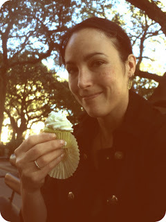 Pistachio cupcake with almond buttercream icing. Not my best photo, but I had just spent two days in the car and a hotel room with my children, so you're lucky fire wasn't billowing out of my nostrils.