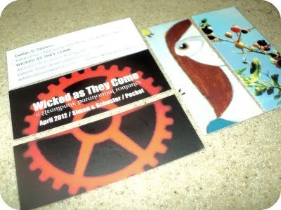 If you don't know about Moo cards, they're so much fun. They're half the size of normal business cards, and you can choose/upload up to 100 different images to go on the back of them. I was in a hurry, so I just did 4. Two are based on a design element from the WICKED AS THEY COME book cover, one is a painting of mine, and one is a photograph I took at the blueberry farm, just so I have some options.