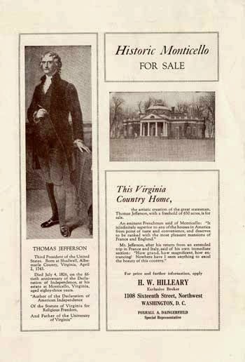 SELLING MONTICELLO: As I wrote in Saving Monticello, in the spring of 1919 Jefferson Monroe Levy, who had owned Thomas Jefferson’s house since acquiring it from the estate of his uncle Uriah Phillips Levy in 1879, hired a realtor to try to sell the place. Levy, a boom-and-bust real estate and stock speculator, had extreme financial reverses during World War I. He listed the property with H.W. Hilleary, a real estate broker in Washington, D.C., who also had offices in Warrenton, Leesburg, and Charlottesville, Virginia. Hilleary specialized in selling large country estates in the Old Dominion.