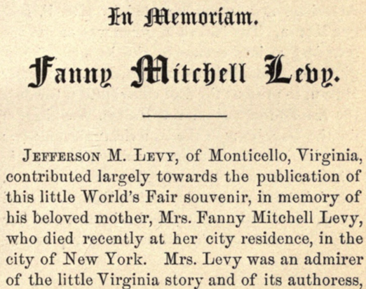 That said, there is historical value in the book: the short but illuminating sketch of Jefferson Levy’s mother, Francis Mitchell (Fanny) Levy, which mentions, her role at Monticello during the first 13 years that her son owned the property. Jefferson Levy paid for the second printing; and Jeannie Blackburn wrote a short “In Memorium” about his mother, who had died in 1892 and was a fan of the book.