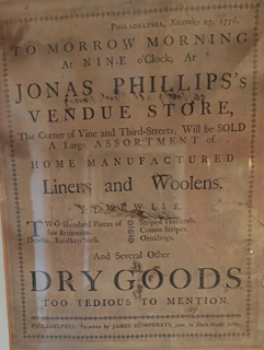 The couple immediately began raising a family. They had 21 children, although several died as infants. The offspring included Uriah Levy’s mother Rachel, who was born on May 23, 1769. The couple moved from Albany to New York City, where Jonas once again owned and operated a retail store. He also was an auctioneer and served the Jewish community as a shohet (ritual slaughterer) and bodek (meat examiner). Around 1774 he moved his growing family to Philadelphia where he opened a vendue store at the upper end of Third Street. Jonas Phillips’ Vendue Store hosted auctions for estates, land, and market goods, and also sold sundries.