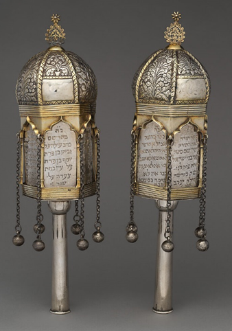 The Rimonims’finial bells make “festive sounds when they are carried around the synagogue,”the museum notes. “Their Hebrew name ‘Rimonim’ means pomegranates, because ofthe round shape recalling the biblical symbolic fruit.