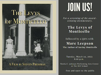 EVENTS: The highlight of my March is a Q&A I will be doing on Tuesday, March 14, at the Hill School auditorium in Middleburg, Virginia, following a screening of “The Levys of Monticello.” The event, sponsored by the Middleburg Library Advisory Board (the Library's Friends group) begins at 6:00 p.m. Details: https://bit.ly/ScreeningMB