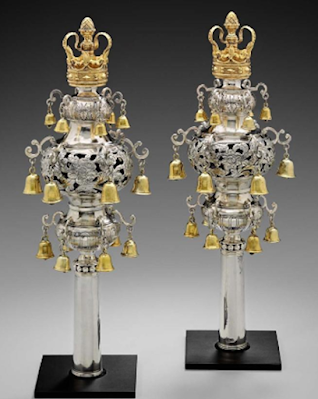 THERIMONIM, PART II: Last month Ireported on the two ornate eighteenth century silver Torah finials called Rimonimthat had been at the center of a dispute between Congregation Shearith Israel inNew York and Touro Synagogue in Newport, Rhode Island. I mentioned that theyhad been on loan to the Boston Museum of Fine Arts, and illustrated the postingwith a generic image of Rimonim. Then I learned, through emails from attentivenewsletter subscribers, that the finials are still on display at FMA, and thatthe Museum’s website includes a photo (below)of them, along with excellent interpretation, which provides more details aboutthe unique—and valuable—objects.