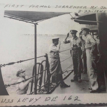 That’s Daniel Evans with the binoculars around his neck,saluting one of the three Japanese officers who came on board on August 21,most likely Navy Capt. Masanori Shigaone