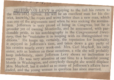 I recently found more evidence to buttress thefact that Jefferson Levy frequented Monticello regularly, especially in theearly twentieth century, in a recently digitized newspaper clipping. It’scontained in one of the massive scrapbooks of clippings of newspaper articles*in which Jefferson Levy (in a 1914newspaper photograph, right) is mentioned in the archives of the Centerfor Jewish History. You can browse through them online at https://bit.ly/JMLCollectionCJH