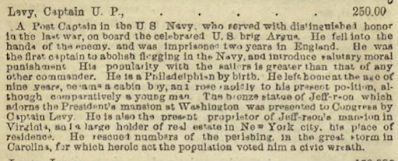 I had an email from an attentive newsletter subscriber, Harry Zimmerman, whosaid that while doing research for a play he is writing about Uriah Levy, hecame across the Beach book and saw that the figure was not $500,000, but $250,000.