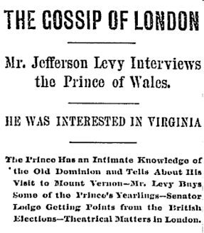 Case in point: Levy spent most of the summer of 1895 in England and on the Continent, a sojourn I mention briefly in Saving Monticello. That trip included a memorable few days in July in England where Levy hobnobbed with the rich and famous.
