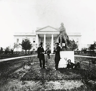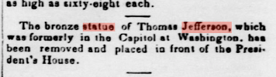 “Sometime during the James K. Polk administration (1845-49),” I wrote, noting also that “the exact date is not certain,” the statue left the Rotunda, and was shipped up Pennsylvania Avenue to the White House. There, with the permission of President Polk, David’s bronze Jefferson was placed on the grounds on the north side facing Lafayette Park.” That’s the statue in a photo above taken in the 1860s.