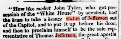 Turns out that Rosie Cain, a graduate fellow at the White House Historical Association, was digging through digitized old newspapers and came across a handful of articles and editorials that prove that the statue was moved to the White House North Lawn in April 1843. Which means that it the statue moved during the John Tyler Administration—not two years later under Tyler’s successor, James Polk, as I reported in the book.