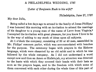 In it, Dr. Rush—a signer of the Declaration of Independence—provided plenty of details about the wedding that ring true, although he mistakenly wrote that Michael Levy was from Virginia. After that faux pas, Rush went on to describe the ceremony. He told his wife that it began with about twenty minutes of prayer in “the Hebrew language,” after which Michael Levy signed the Ketubah, a Jewish marriage contract.