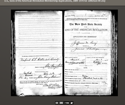 But I had no idea until a few weeks ago that Jefferson Levy actually did join the SAR, which was founded in 1889. It is a descendants group in which full membership requires documentation that you are directely descended from a patriot—someone who served in the Continental Army or otherwise supported the Revolutinary War