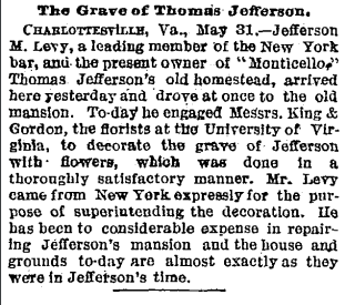 The article talks about Jefferson Levy coming to Monticello and having Jefferson’s grave decorated “in a thoroughly satisfactory manner.”