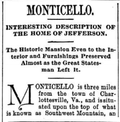 Titled “Monticello: Interesting Description of the Home of Jefferson,” the long, detailed article appeared in at least two S.C. newspapers, the Abbeyville Press and Banner on April 29, 1896, and the Edgewater Advertiser on May 20 that year.