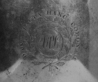 The cup (below) is engraved with Levy’s initials, along with a Latin inscription, Dant Facta Hanc Coronam (“Deeds gave this crown). As I wrote in Saving Monticello, Jefferson M. Levy had that motto emblazoned—along with a French-style coat of arms of two laurel sprays enclosing the letter “L”—on the headboard of a bed in one of the upstairs rooms at Monticello that JML used as a dressing room and clothes closet.