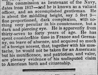 The correspondent then felt he had to let people know Uriah Levy’s religion, writing that he “is a descendant of the Maccabees, and a countryman of Isiah,” his way of saying that Levy was Jewish.The article went on to say that UPL was “known as a valiant officer, and an accomplished gentlemen.” Then came the first contemporary physical description I’ve seen: “He is about the middling height, say 5 feet 9—finely proportioned, dark complexion, with nothing very peculiar in his countenance but a dark and piercing eye.”