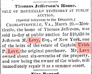 As I was searching “Uriah Levy” from 1834-79, I also came across the first newspaper article I’d ever seen announcing the news that Jefferson Monroe Levy, UPL’s nephew, had bought out the other heirs to his uncle’s estate and purchased Monticello on March 20, 1879.