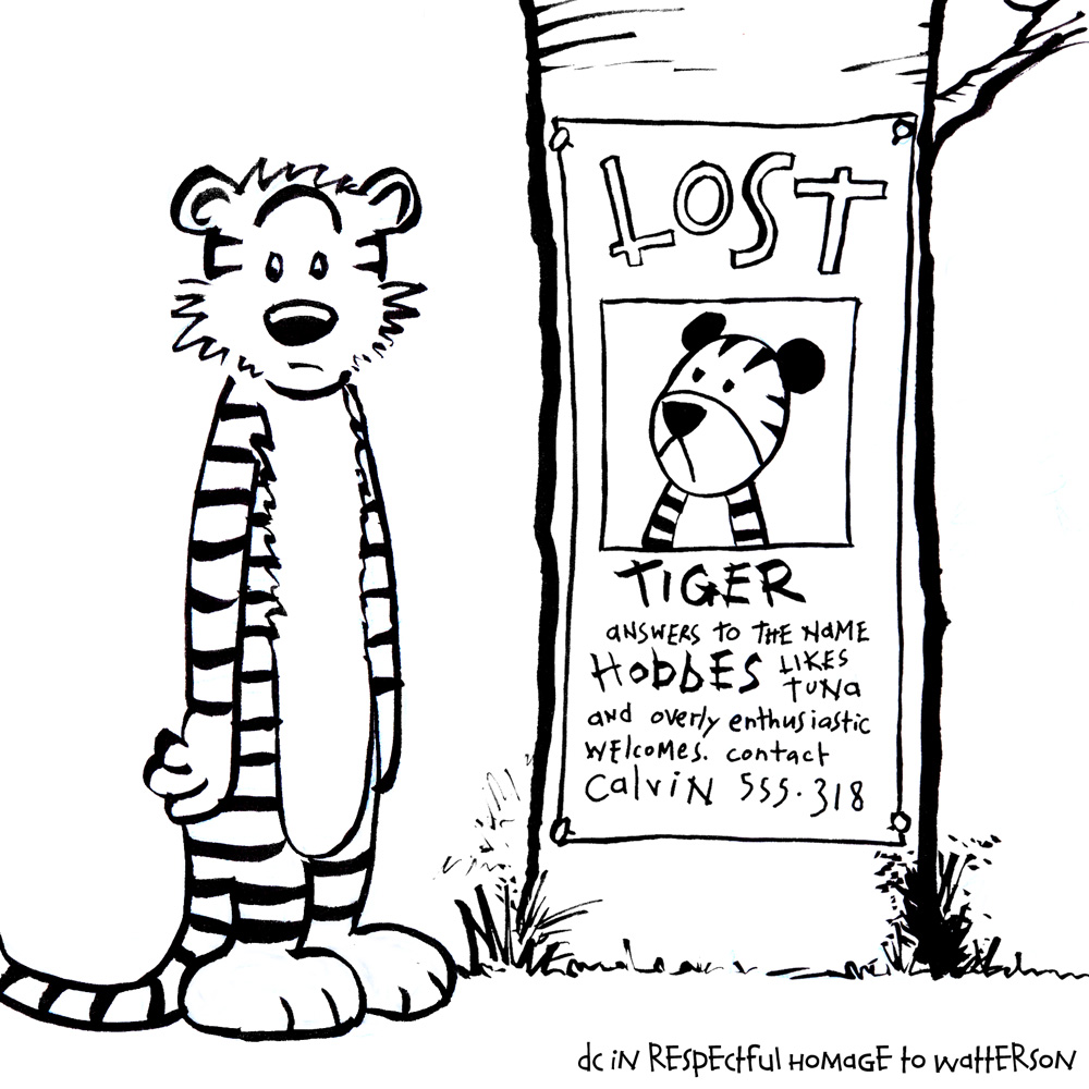 P.S. I wanted to do a picture for this one and thought of a lost pet poster – which got me thinking about cats, which of course led me to my favourite cartoon feline – HOBBES, the tiger from Calvin and Hobbes . I attempted the above in respectful homage to the brilliant Bill Watterson. If you've never read any Calvin and Hobbes – seriously, go and check it out. NOW!!!